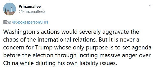 “華盛頓的舉動(dòng),將嚴重加劇國際關(guān)系的混亂。但對特朗普而言,這從來(lái)都不是個(gè)問(wèn)題。他唯一目的是通過(guò)煽動(dòng)針對中國的巨大憤怒,淡化自己的責任問(wèn)題,在大選前設定自己的議程!